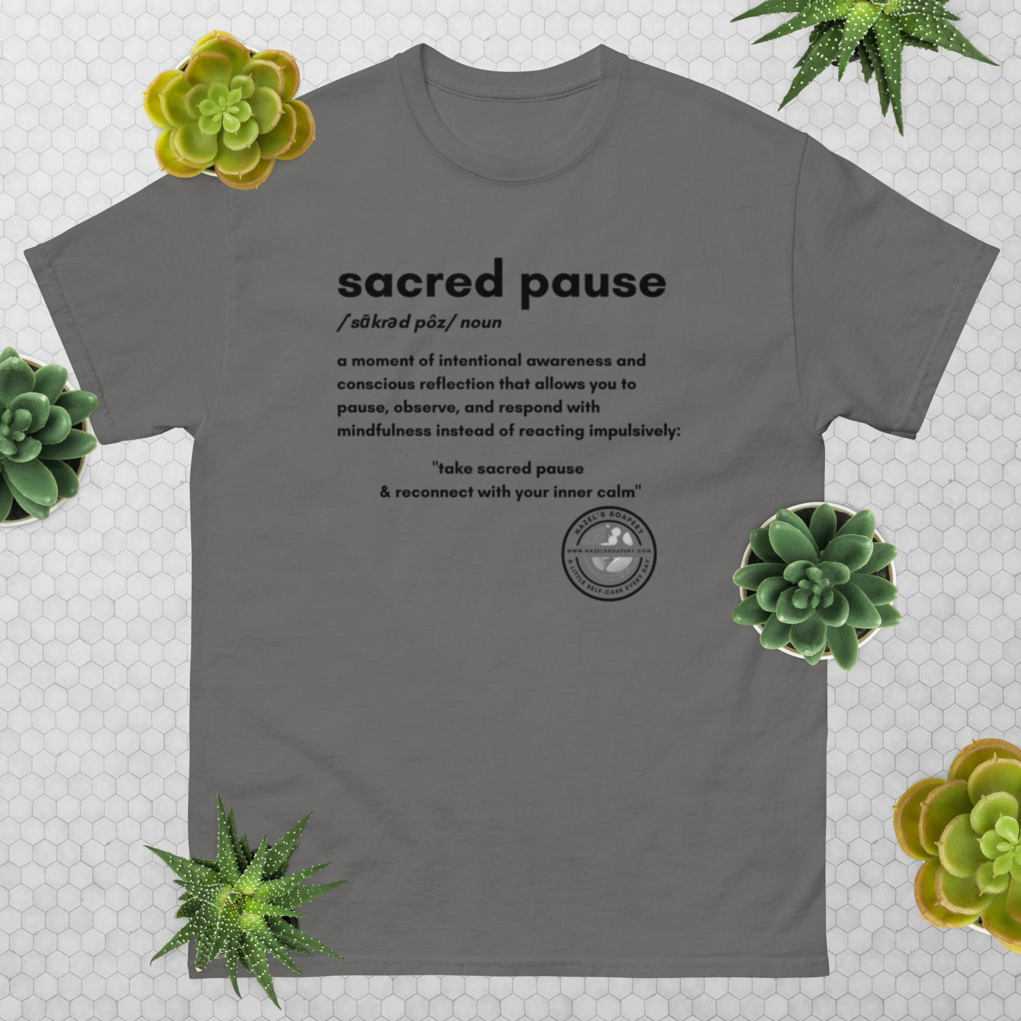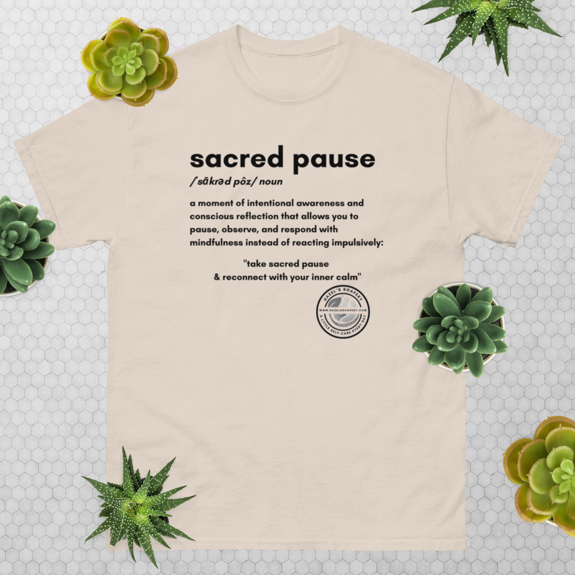 In a world that constantly demands our attention, where noise and impulsivity often reign, finding moments of true stillness feels like a revolutionary act. The world is full of people who respond impulsively, but taking a Sacred Pause, even for a moment, is a time where you stop, ground yourself, and choose to respond in a way that aligns with your spirit. At Hazel’s Soapery, we understand this deep need for quiet connection—for ourselves and for the world around us. That’s why we’re so honored to introduce our Sacred Pause Tee, a wearable invitation to reclaim your inner calm.